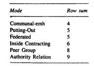 Although there are some dimensions for which best or worst efficiency ratings are easily made (e.g. the Putting-Out mode has the worst transportation expense features; the Communal-emh mode, where workers move successively across stations and appropriate the fruits of their own labors, has the best work intensity and interface leakage properties but is worst in equipment utilization respects; the Authority Relation has the best system responsiveness properties; and so on), there is little to be gained by using a fourfold ranking system (best,, good, poor, worst) rather than a simpler bivariate ranking in which best or good modes are assigned the value 1 and poor or worst modes are rated 0.