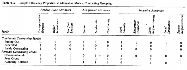 Consider now Table 9-2, where the same rankings are displayed—only here the modes are grouped by contracting attribibutes. The striking features are: (1) Continuous contracting modes have generally poor product flow attributes and uniformly poor local and system responsiveness attributes; (2) continuous contracting modes are uniformly good in station assignment, work intensity, and local innovation respects; (3) periodic contracting modes have generally good product flow attributes; and (4) although some periodic con- tracting modes are good in assignment and incentive respects, no general statements can be made for periodic contracting modes as a group in either of those general categories.