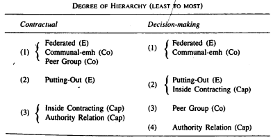 Although capitalist modes are more hierarchical than collective ownership modes from a contractual point of view, the more critical hierarchy for performance purposes is the decision-making hierarchy. The observed relation between ownership and hierarchy is very weak in decision-making respects. The least hierarchical modes, Federated and Communal-emh, are of different ownership kinds (entrepreneurial and collective ownership, respec- tively) The Peer Group, Putting-Out, and Inside Contracting modes have intermediate degrees of hierarchy, and each is from a different ownership Class. Although the most hierarchical decision-making mode is the capitalist mode, the next strongest command hierarchy features collective ownership.