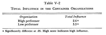 The reader will recall that in discussing this matter of total influence in the plastics companies we offered two possible reasons why high total influence could contribute to effective conflict resolution and performance: by improving managerial motivation, or by improving the quality of decisions as the relevant knowledge was brought to bear. Now the evidence from the container companies would indicate that the latter explanation is the more valid. Having the knowledgeable people exert the influence seems to contribute to the quality of conflict resolution, even though it depresses the total influence. This is not to say that it might not also have a lesser side effect in depressing motivation. More will be said about this below.