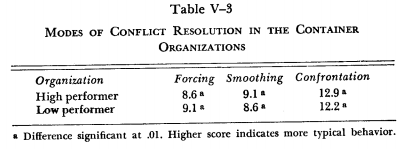 A final factor related to our present discussion is the mode of behavior used to resolve conflict. In the high-performing organization there was significantly more confrontation than in the low-performing competitor (Table V-3). Judging from the pattern of hierarchical influence discussed above, much of the confrontation in the high-performing organization was apparently at the upper organizational levels. As we have suggested, however, many technical and quality problems were resolved at lower levels, again through the use of confrontation. These managers were apparently solving their conflicts and reaching decisions by openly examining different points of views. This difference between the high- and low-performing container organizations is consistent with our earlier findings in the plastics industry about the importance of confrontation of conflict for effective decision making.