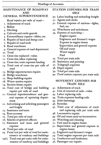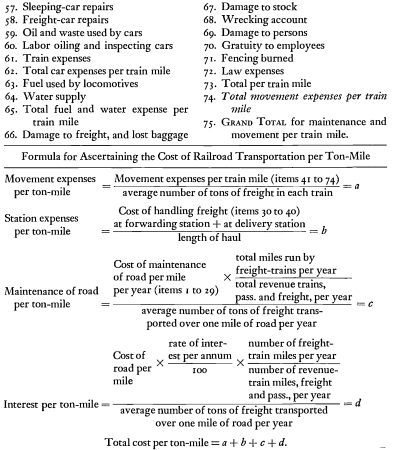 In order to make use of this formula it is necessary to know . . . fifty-eight items of expense [above], all of which vary on different roads, and enter into different com- binations with each other. Some of the items of movement expenses (41 to 74) change with the weight of trains, and have to be ascertained in each individual case. The average cost for the year can be made the basis of the estimate. Besides the items shown [above], the following other items enter into the calculation: the average number of tons of freight in train per mile of the round trip of the train, the average length of haul, the number of miles run over the road with freight and passenger-trains per annum, the cost of the road, the rate of interest, and the total number of tons of freight carried during a year over one mile of road. Without these data it is impossible to make a correct estimate of the cost of transportation on railroads.