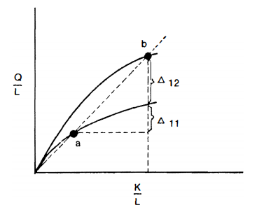 The two interpretations are different in the following “growth accounting” sense. In the case of Figure 8. 1, output would have grown by Δ11 if capital per worker had grown as it did, but the pro duction function had not shifted . Δ12 represents the increase in out put p er worker not explained by growth of the capital-labor ratio and due, in some sense, to technical change. In Figure 8. 2, Δ21 can be attributed to growth of capital per worker and Δ22 to technical change in the sense above. In the latter interpretation the lower elasticity of substitution means that less of the productivity growth can be attrib uted to growing capital intensity; hence, more must be attributed to improved technology. Since both interpretations are equally consist ent with the time series data, there is no way to choose between them without a priori assumptions or other data.