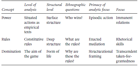 To the extent that meanings become fixed or reified in certain forms, which then artic- ulate particular practices, agents and relations, this fixity is power. Power is the appar- ent order of taken-for-granted categories of existence, as they are fixed and represented in a myriad of discursive forms and practices. (Clegg 1989: 183)