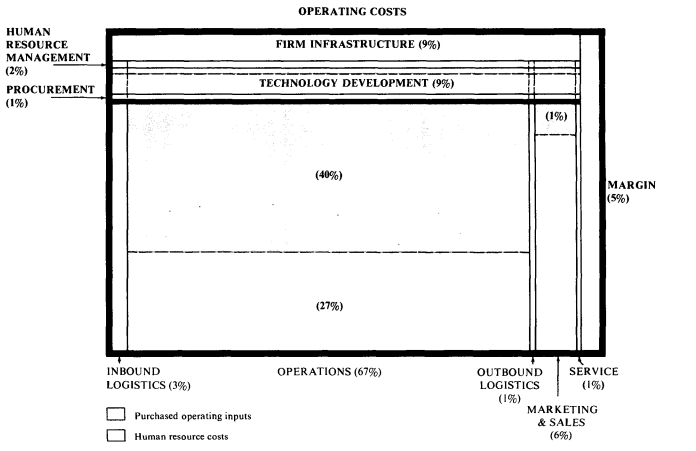 The allocation of costs and assets will produce a value chain that illustrates graphically the distribution of a firm’s costs. It can prove revealing to separate the cost of each value activity into three categories: purchased operating inputs, human resource costs, and assets by major category. The proportions of the value chain can be drawn to reflect the distribution of costs and assets among activities as shown in Figure 3-1.