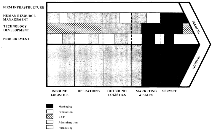 A firm may be able to draw unit boundaries more in tune with its sources of competitive advantage and provide for the appropriate types of coordination by relating its organizational structure to the value chain, and the linkages within it and with suppliers or channels. An organizational structure that corresponds to the value chain will improve a firm’s ability to create and sustain competitive advantage. While this subject cannot be treated in detail here, it remains an important issue in the implementation of strategy.