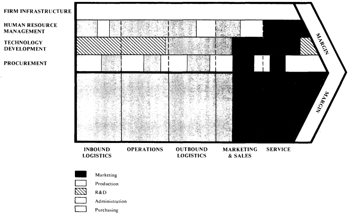 The value chain provides a systematic way to divide a firm into its discrete activities, and thus can be used to examine how the activities in a firm are and could be grouped. Figure 2-5 shows a value chain with a typical organizational structure superimposed. Organizational boundaries are often not drawn around the groups of activities that are most similar in economic terms. Moreover, organizational units such as the purchasing and R&D departments frequently contain only a fraction of the similar activities being performed in a firm.
