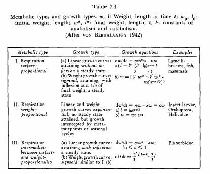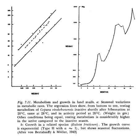 A case to the point are seasonal changes. Berg (1959, 1961), while in general confirming previous data, found that the size- metabolism relation varies seasonally in snails:………………… “Thus the relation, oxygen consumption to body size, is not a fixed, un- changeable quantity characteristic of all species as supposed by Bertalanffy If (Bertalanffy’s theory) were true, then the observed seasonal variation in metabolic type would imply a seasonal variation in the type of growth rate.”