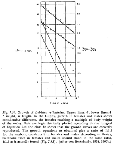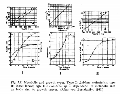 It is obvious that the theory has been developed for a limited number of cases only, owing to the limited number of good data and the time-consuming nature both of observation and calculation of growth. Hemmingsen (1960) has made this clear: “With n varying as much as the examples show, within any group with allegedly (or at least first allegedly) uniform growth type, it seems impossible to accept Bertalanffy’s generalizations unless a statistically significant correlation between n and growth type can be demonstrated on a much larger number of examples than the few ones which Bertalanffy has repeatedly published.” I entirely agree with this criticism; many more data would be desirable, although one should not cavalierly bypass those offered in confirmation of the theory, even if they are some 20 years old. I would amend Hemmingsen’s criticism by suggesting reexamination on a broader basis. This should include at least the following items: analysis of a large number of growth data, now made possible by electronic computers; concurrent determination of size-dependence of resting metabolism (constant a) in these cases; determinations of protein catabolism (constant K ); determination, in related species, of the ratios between allometry exponents of metabolic rates and the theoretically identical ratios of the anabolic constants ( η ). These are all interesting and somewhat neglected research problems; and if the model does no more than bring them to the fore, it has proved its usefulness.
