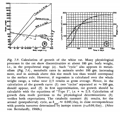 - The most important criticism becomes apparent from the above It was said that there appear to be so-called metabolic types and growth types and correlations between both. However, earlier it has been emphasized that the parameters implied, especially the relation of metabolic rate to body size expressed in the exponent a, can be altered and shifted with experimental conditions (FIGS. 7.4-7.7). Similarly, also growth curves are not fixed. Experiments on the rat have shown that the shape of the growth curve, including location and existence of a point of inflection, can be changed by different nutrition (L. Zucker et al., 1941a, 1941b, 1942; T.F. Zucker et al., 1941; Dunn et al., 1947; Mayer, 1948). None of the characteristics is rigid— and, incidentally, within my own biological concepts, I would be the last to presuppose rigidity in the dynamic order of physiological processes. According to my whole biological outlook, I am rather committed to the ancient Heraclitean concept that what is permanent is only the law and order of change.