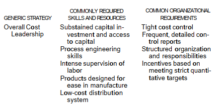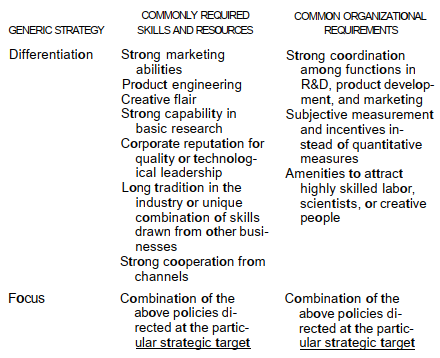The three generic strategies differ in dimensions other than the functional differences noted above. Implementing them successfully requires different resources and skills. The generic strategies also im-ply differing organizational arrangements, control procedures, and inventive systems. As a result, sustained commitment to one of the strategies as the primary target is usually necessary to achieve suc-cess. Some common implications of the generic strategies in these areas are as follows: