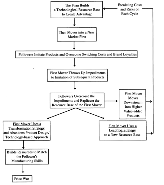 At this point some first movers use a leapfrogging strategy to create a new resource base. This begins the cycle again, but with higher risks and greater costs. If the first mover does not choose to leapfrog, it can use a transformation strategy to compete with later entrants by replicating their resource base of process know-how and low-cost manufacturing methods. The transformation strategy leads to a price war, and the leapfrogging strategy eventually leads to risks and costs that are greater than the re-