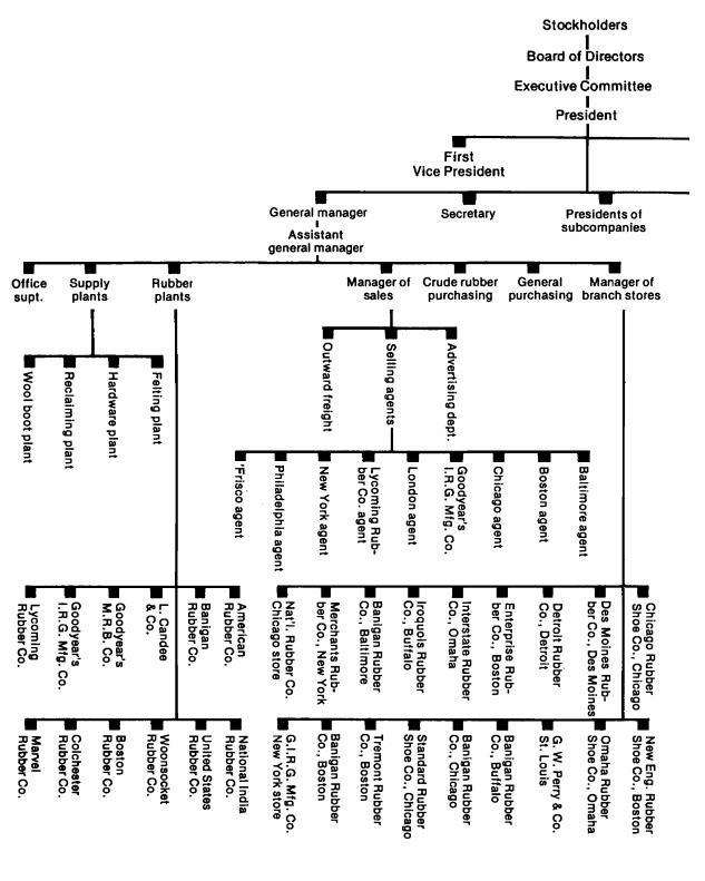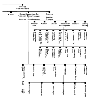 As the company’s organization chart for 1917 (figure 10) reveals, its structure was moving toward what became defined in the 1920s as the multidivisional form. By 1917 the company managed footwear, its original business, through an integrated division. On the other hand, tires and industrial rubber goods continued to be sold through a single sales force, even though they went to very different markets. The number of top managers had increased and the central staff included offices to handle purchasing, research and development, traffic, advertising, legal affairs, and finance. But the relationships between the central staff and the divisional managers and the staff and the general executives on the executive committee were not yet clear. Overlapping functions and activities existed, as well as confused lines of communication, authority, and responsibility. These remained until the company underwent a complete administrative reorganization in the late 1920s. The experience of United States Rubber, like that of Standard Oil, suggests that unless close attention was paid to organization matters, administrative confusion resulted.