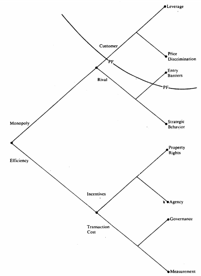 The recent strategic behavior literature excepted, all the monopoly ap- proaches to contract work within the neoclassical framework, where the firm is regarded as a production function. Inasmuch as the natural boundaries of the firm are therein defined by technology, any effort by the firm to extend its reach by recourse to nonstandard contracting was presumed to have monopoly purpose and effect.12 This “applied price theory” approach to industrial organization was the prevailing postwar orientation. As Coase observed (1972, p.61), it informed both of the leading industrial organization texts— the one by Joe Bain (1958); the other by George Stigler (1968). The inhospitality approach to antitrust law enforcement, to which I referred in 1.1, was similarly oriented. Much of the strategic behavior literature, by contrast, is more closely associated with the governance structure conception of the enterprise (see Chapter 14). So as to highlight this important monopoly distinction, the dashed curve (denoted PF) in Figure 1-1 separates the earlier production function approaches from the more recent strategic conception of contract.