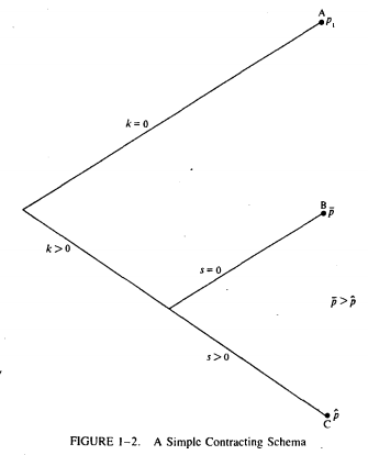 Figure 1-2 displays the three contracting outcomes corresponding to such a description. Associated with each node is a price. So as to facilitate comparison between nodes, assume that suppliers (I) are risk neutral, (2) are prepared to supply under either technology, and (3) will acceprany safeguard condition whatsoever so long as an expected breakeven result can be projected. Thus node A is the general purpose technology (k = 0) supply relation for which a breakeven price of pt is projected. The node B contract is supported by transaction-specific assets (k > 0) for which no safeguard is offered (s = 0). The expected breakeven price here is p¯. The node C contract also employs the special purpose technology. But since the buyer at this node provides the supplier with a safeguard, (s > 0), the breakeven price, pˆ, at node C is less than p¯.