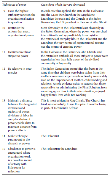 Many of the techniques that were evident in total institutions can be used to make everyday acts of extreme power easier to think and to do. What these extreme cases do is throw everyday power practices into sharp relief. Any one of the techniques in Table 6.1, abstracted from the cases reviewed here, is a significant and subtle power practice; combined they are a formidable weapon against ethical rectitude in everyday life.