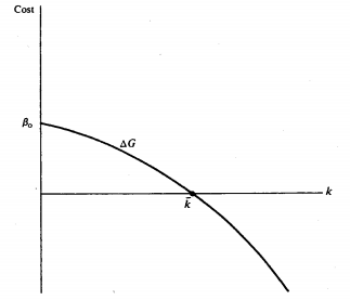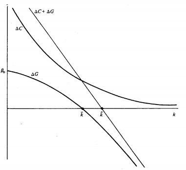 This ΔC relation is shown in Figure 4-2. The object, of course, is not to minimize ΔC or ΔG taken separately but, given the optimal or specified level of asset specificity, to minimize the sum of production and governance cost differences. .The vertical sum ΔG + ΔC is also displayed. The crossover value of k for which the sum (ΔG + ΔC) becomes negative is shown by k, which value exceeds k. Economies of scale and scope thus favor market organization over a wider range of asset specificity values than would be observed if steady state production cost economies were absent.