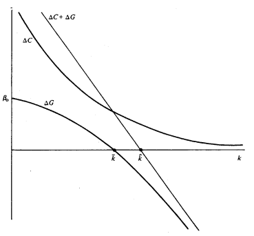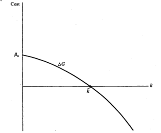 This ΔC relation is shown in Figure 4-2. The object, of course, is not to minimize ΔC or ΔG taken separately but, given the optimal or specified level of asset specificity, to minimize the sum of production and governance cost differences. .The vertical sum ΔG + ΔC is also displayed. The crossover value of k for which the sum (ΔG + ΔC) becomes negative is shown by kˆ, which value exceeds k¯. Economies of scale and scope thus favor market organization over a wider range of asset specificity values than would be observed if steady state production cost economies were absent.