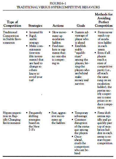 This difference between traditional competition, used when the environment stayed stable for years, and hypercompetition is illustrated in Figure 6-1. As shown in the first box of each row of the figure, the strategies needed to succeed in traditional stable environments are very different from those needed to succeed in hypercompetition.