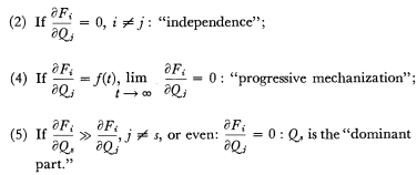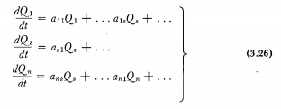 (4) There is a further case which appears to be unusual in physical systems but is common and basic in biological, psychological and sociological systems. This case is that in which the interactions between the elements decrease with time. In terms of our basic model equation (3.1), this means that the coefficients of the Qi. are not constant, but decrease with time. The simplest case will be: